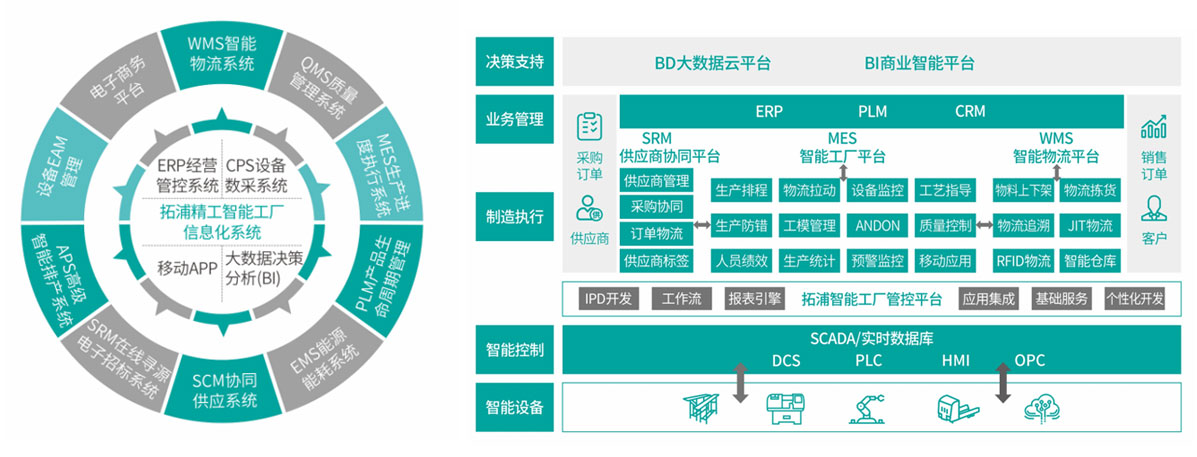 公司信息化系統(tǒng)包括:PLM、ERP、APS、MES、CPS、WMS、QMS、SCM、BI等14個模塊, 實現(xiàn)外部互聯(lián)(客戶、供應商)、內(nèi)部互聯(lián)(人、機、料、法、環(huán)、測),使得經(jīng)營和生產(chǎn)全過程數(shù)據(jù)可采集、可分析、可追溯。